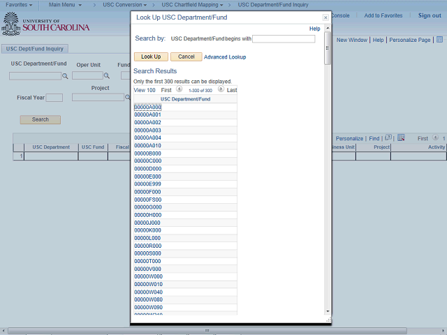 In this example, you want to view the new PeopleSoft ChartField String information for USC Department/Fund "65300E700".