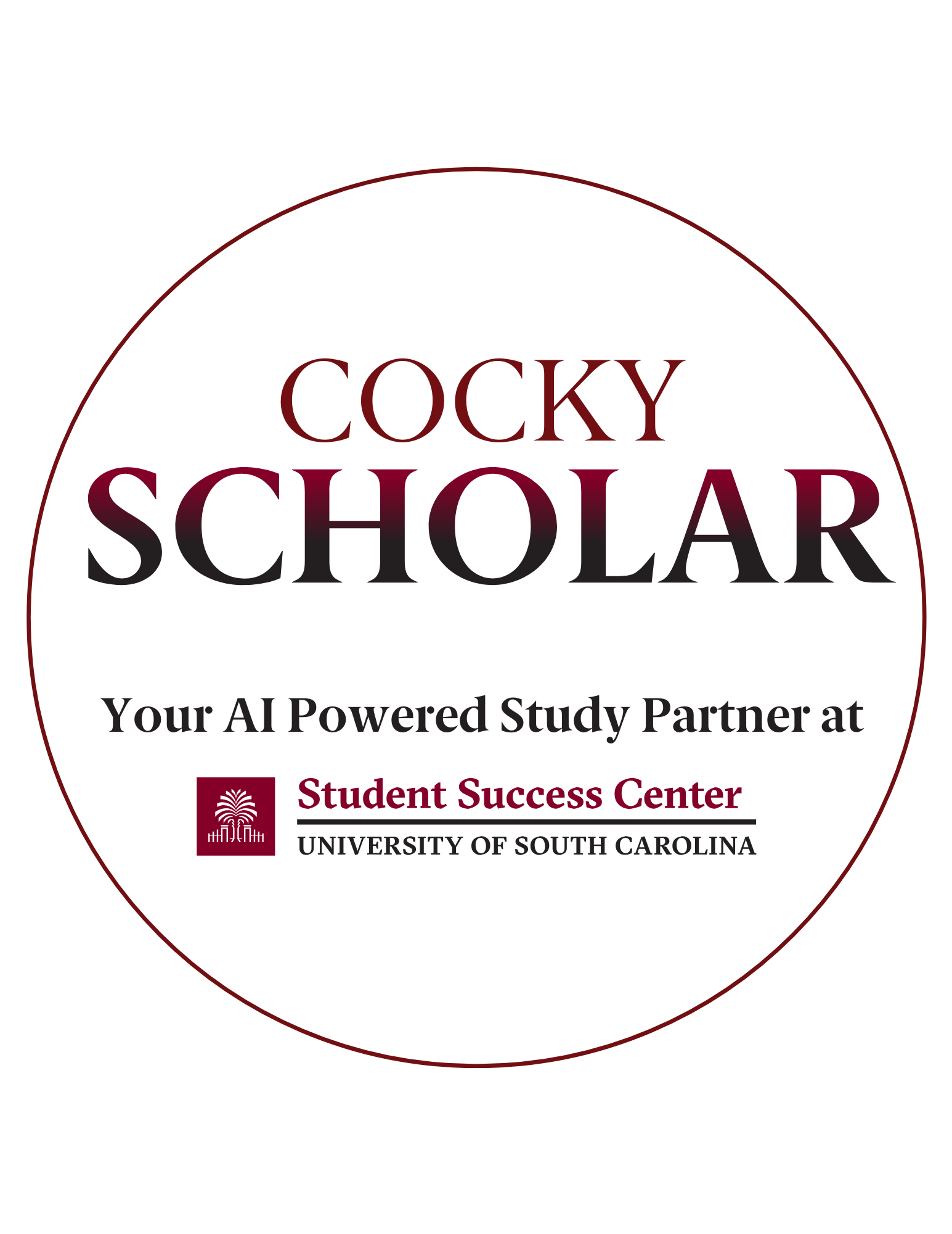 Circular logo reading “Cocky Scholar” with the subtitle “Your AI Powered Study Partner at Student Success Center, University of South Carolina,” displayed in garnet text with the USC Student Success Center logo.
