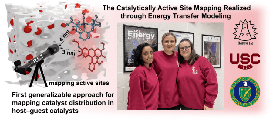 Leading by the senior graduate student Buddhima Maldeni, the Shustova group in collaboration with the Boston College team introduced a novel concept for catalyst mapping, aimed at understanding the distribution of active sites in heterogeneous host-guest catalysts within porous matrices: “Catalytically Active Site Mapping Realized through Energy Transfer Modeling” (Angew. Chem. Int. Ed. 2025, 64, e202416695). These studies present the first transformative approach for mapping molecular-level guest distribution in heterogeneous host-guest catalytic systems. It provides a foundation for predicting and optimizing catalyst performance within various porous supports, paving the way for developing next-generation heterogeneous catalysts, including platforms for highly efficient cascade or tandem catalytic processes.