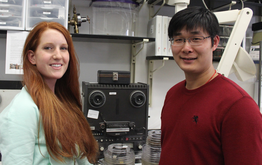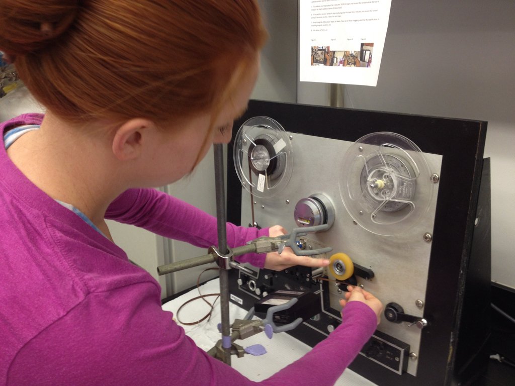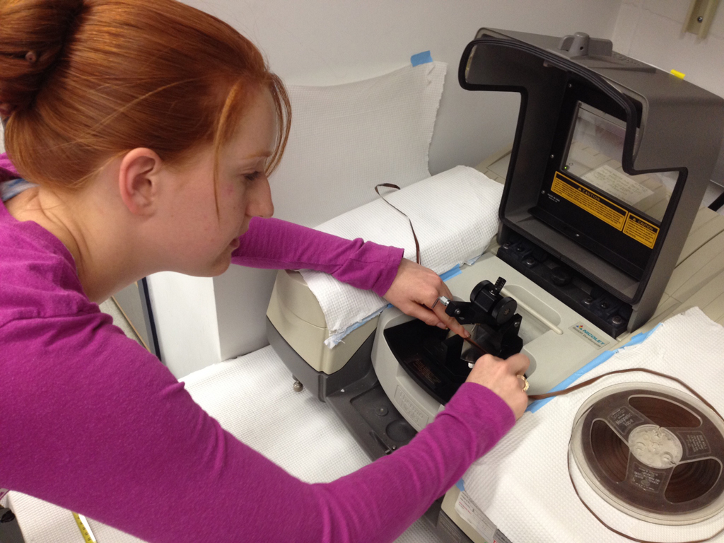 Cassidy is working in Morgan’s lab to help develop a nondestructive approach he devised for predicting which tapes are in need of restoration. The method combines infrared spectroscopy with statistical pattern recognition.