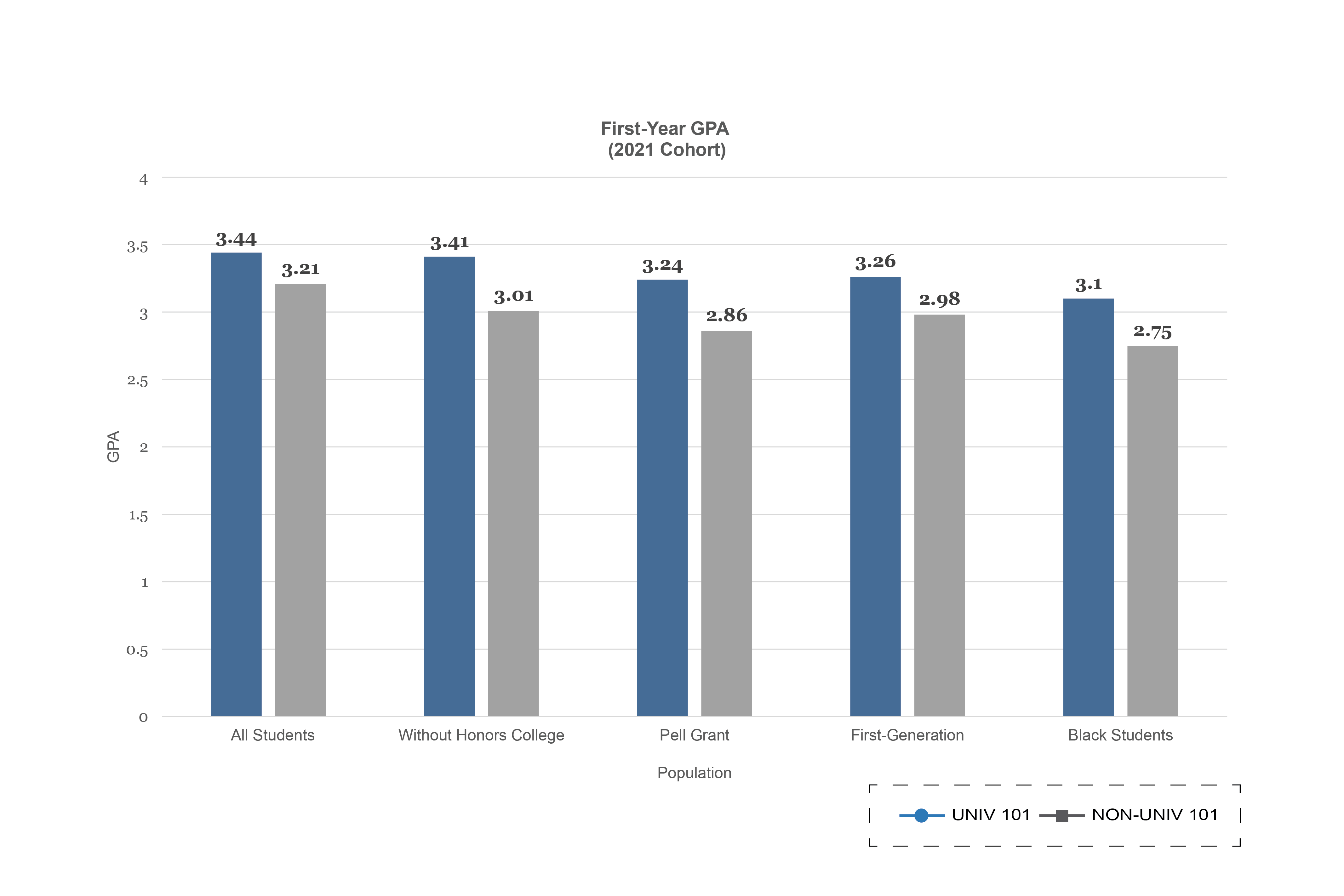 Note: Given that these students have significantly higher predicted grades and tend to enroll in UNIV 101 at a lower rate than other students, excluding these students from the analyses provides a more accurate picture of the impact of the course.