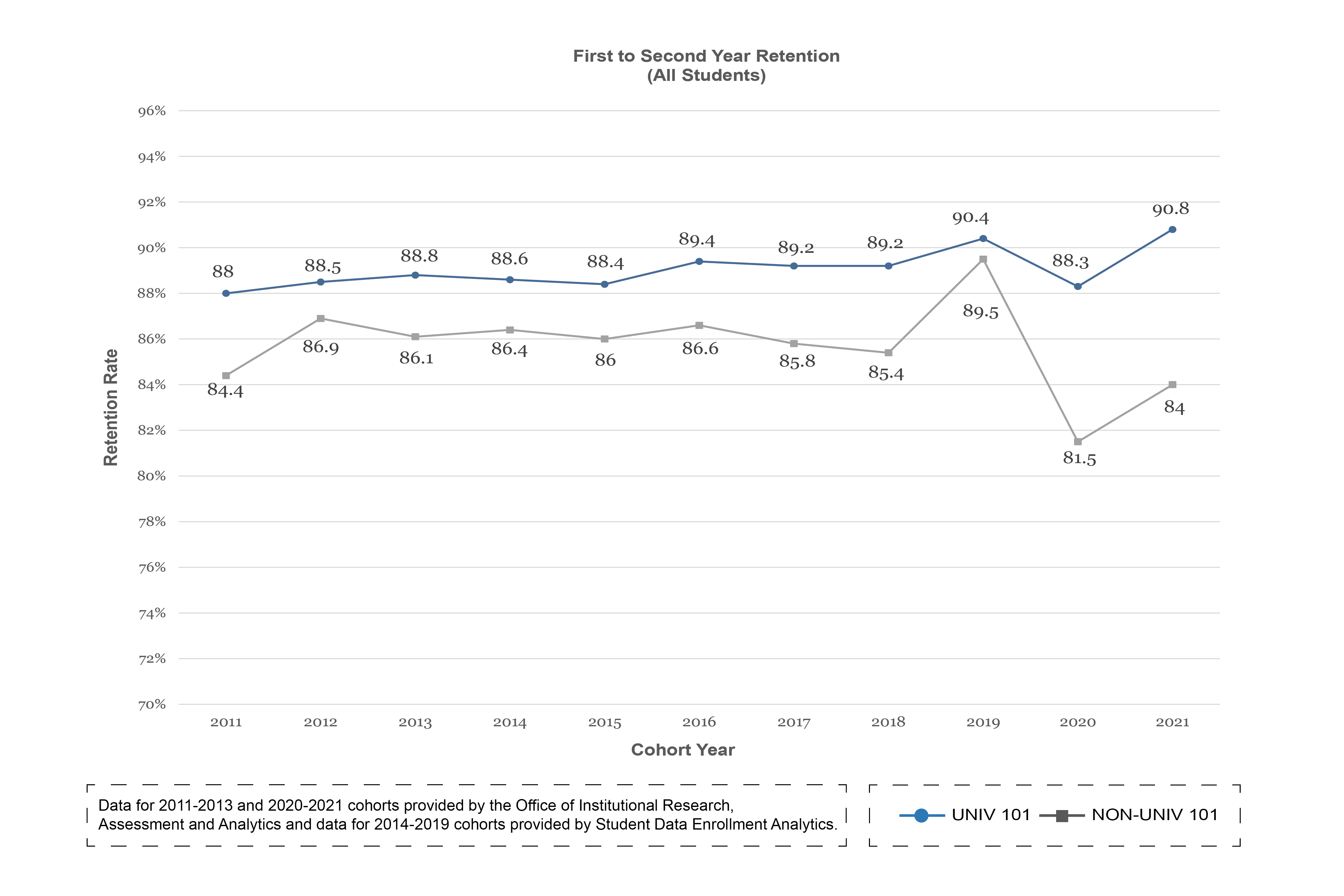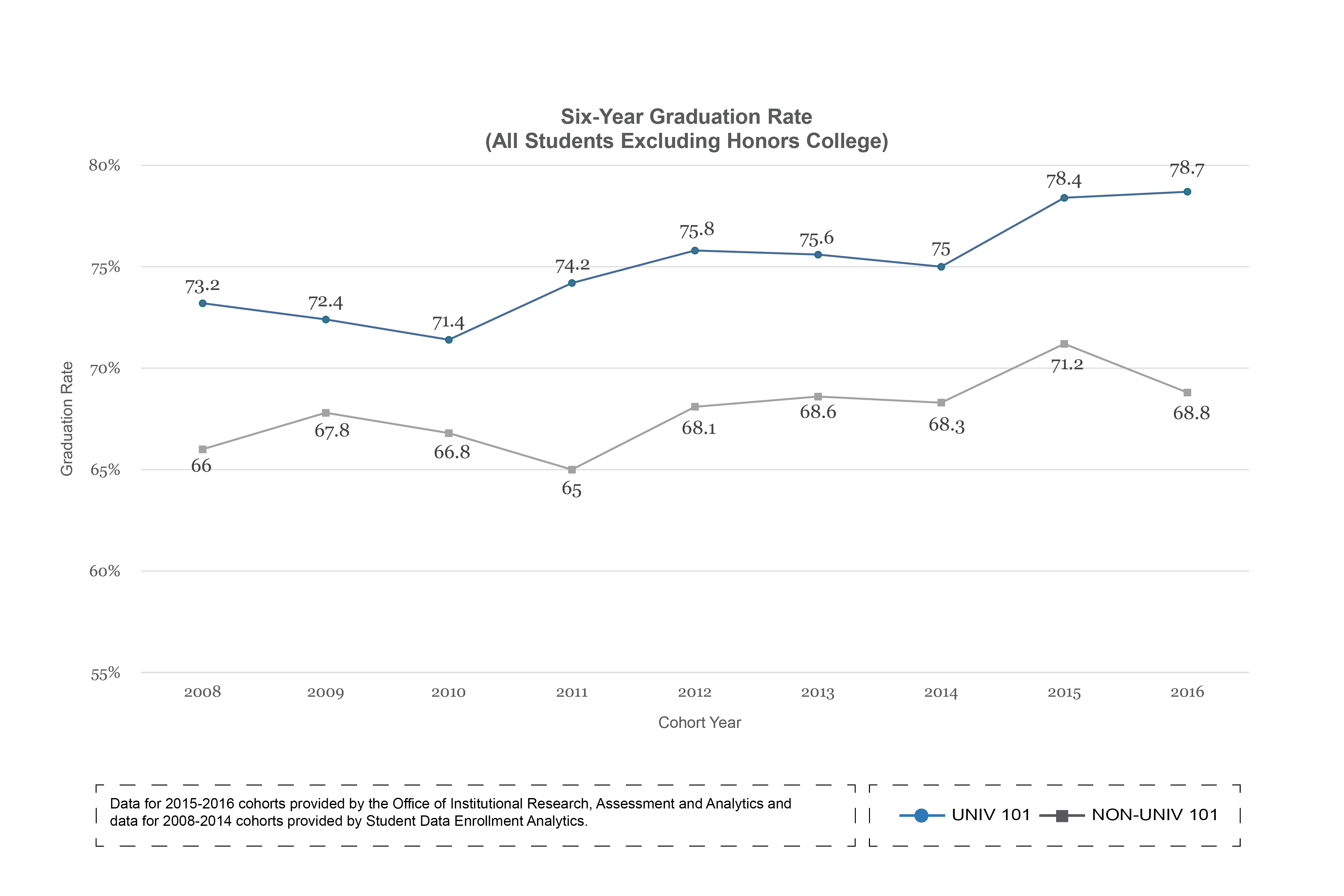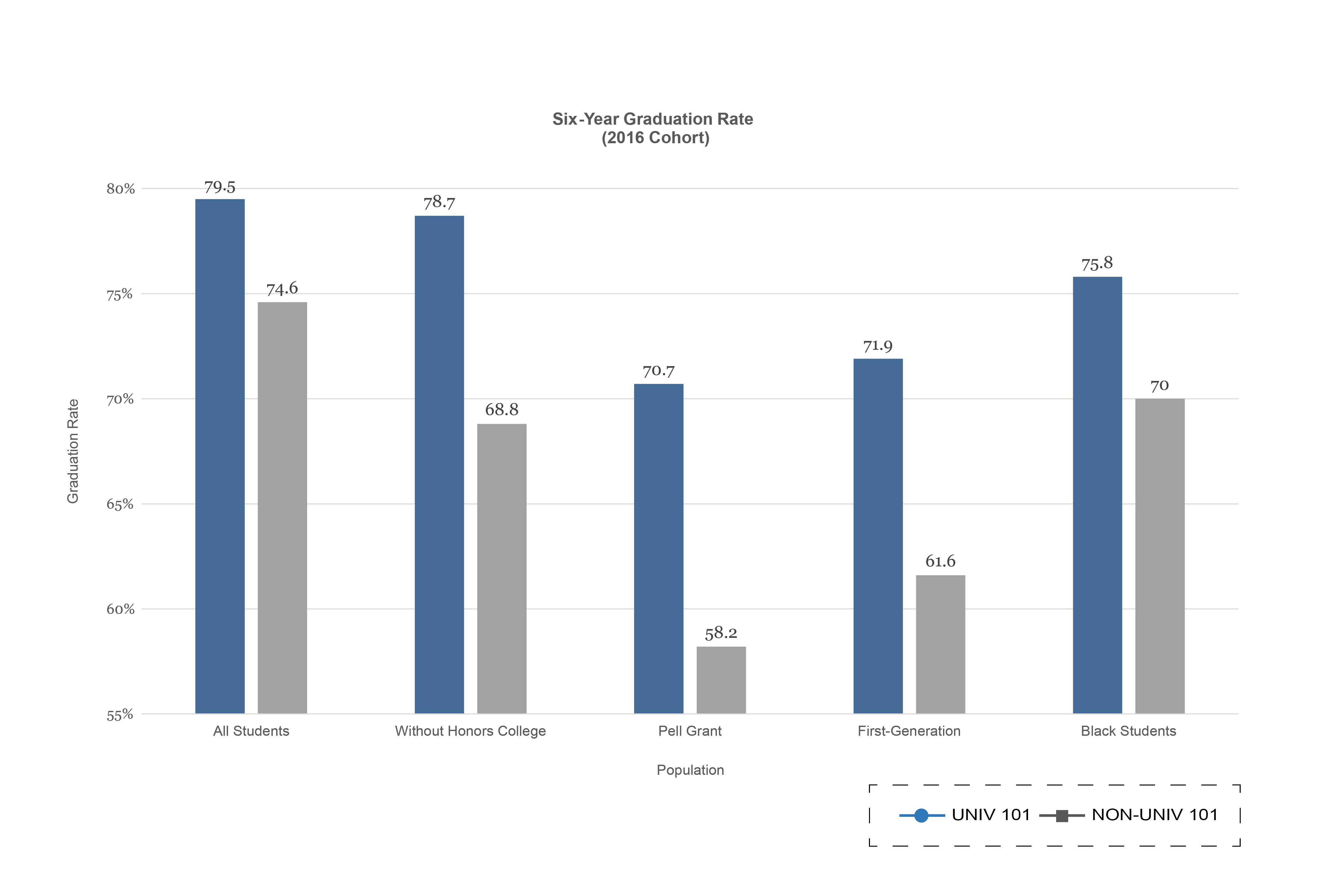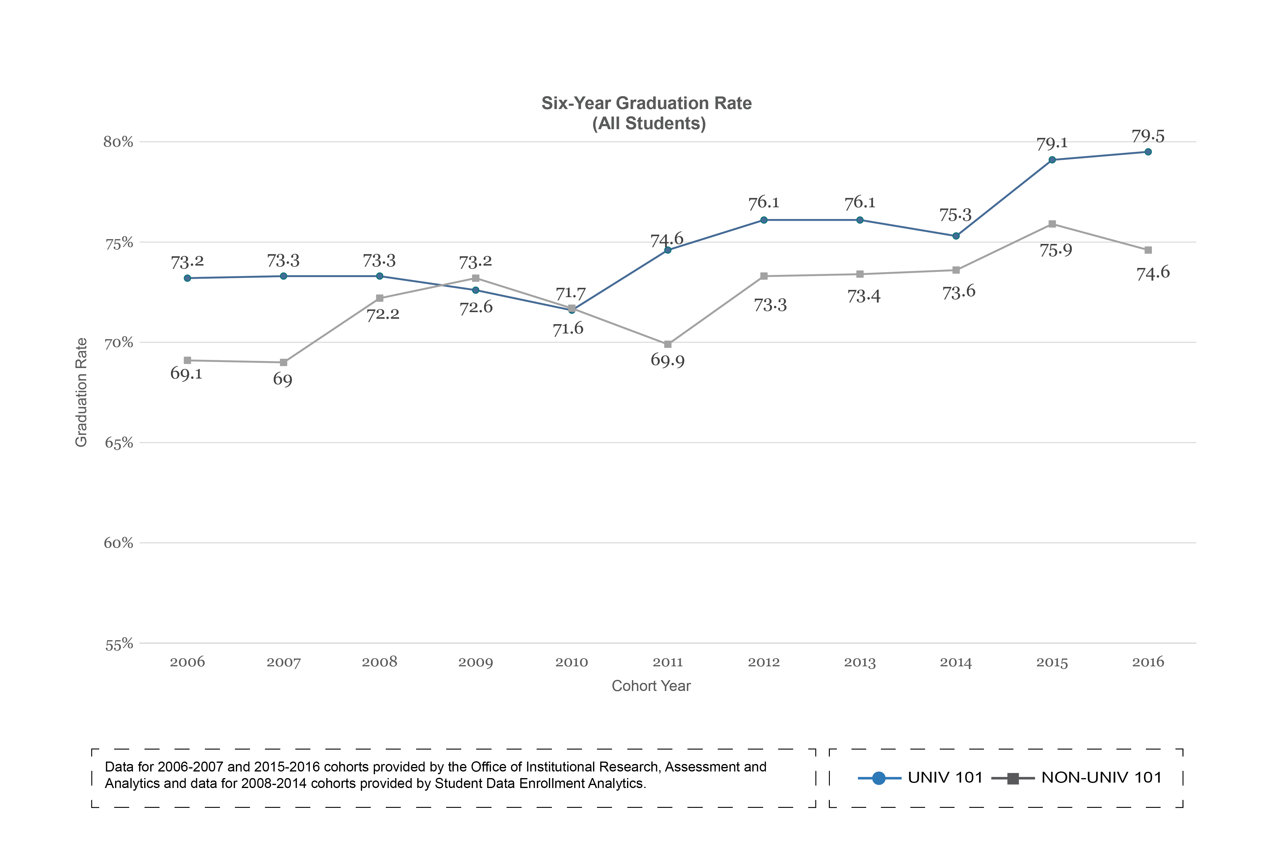 UNIV 101 students have consistently had higher one-year retention rates, six-year graduation rates and first-year GPAs than students who do not enroll in the course.