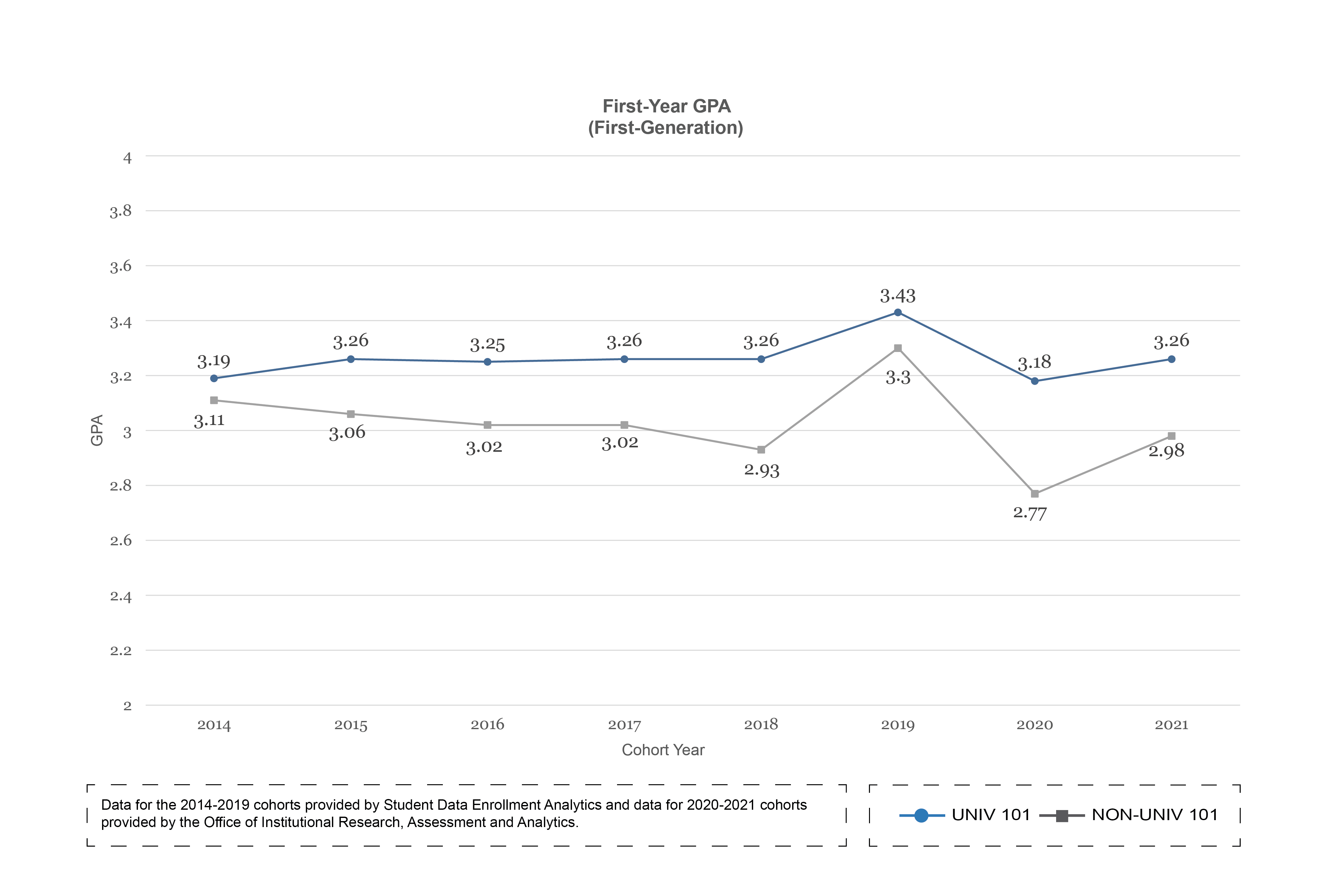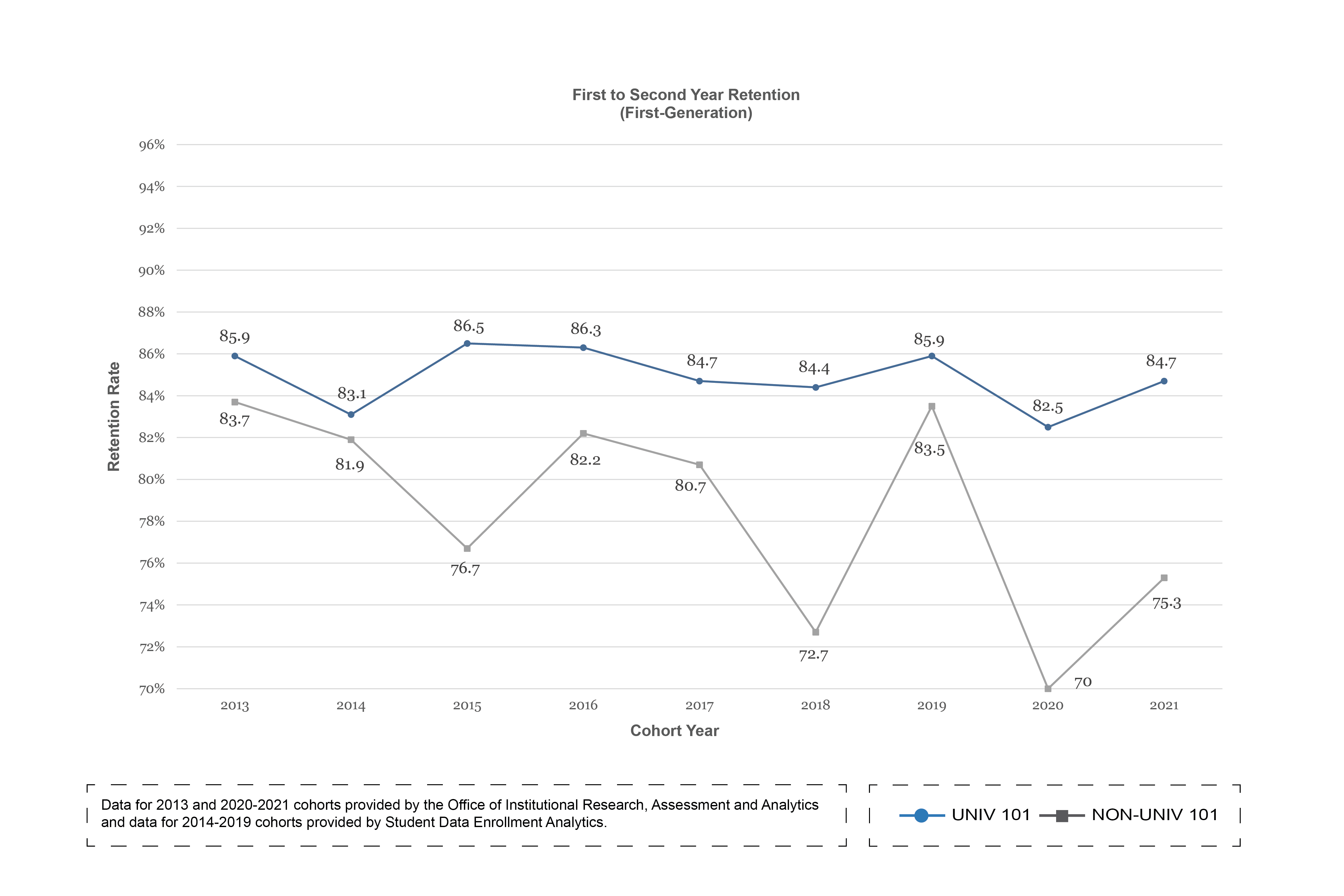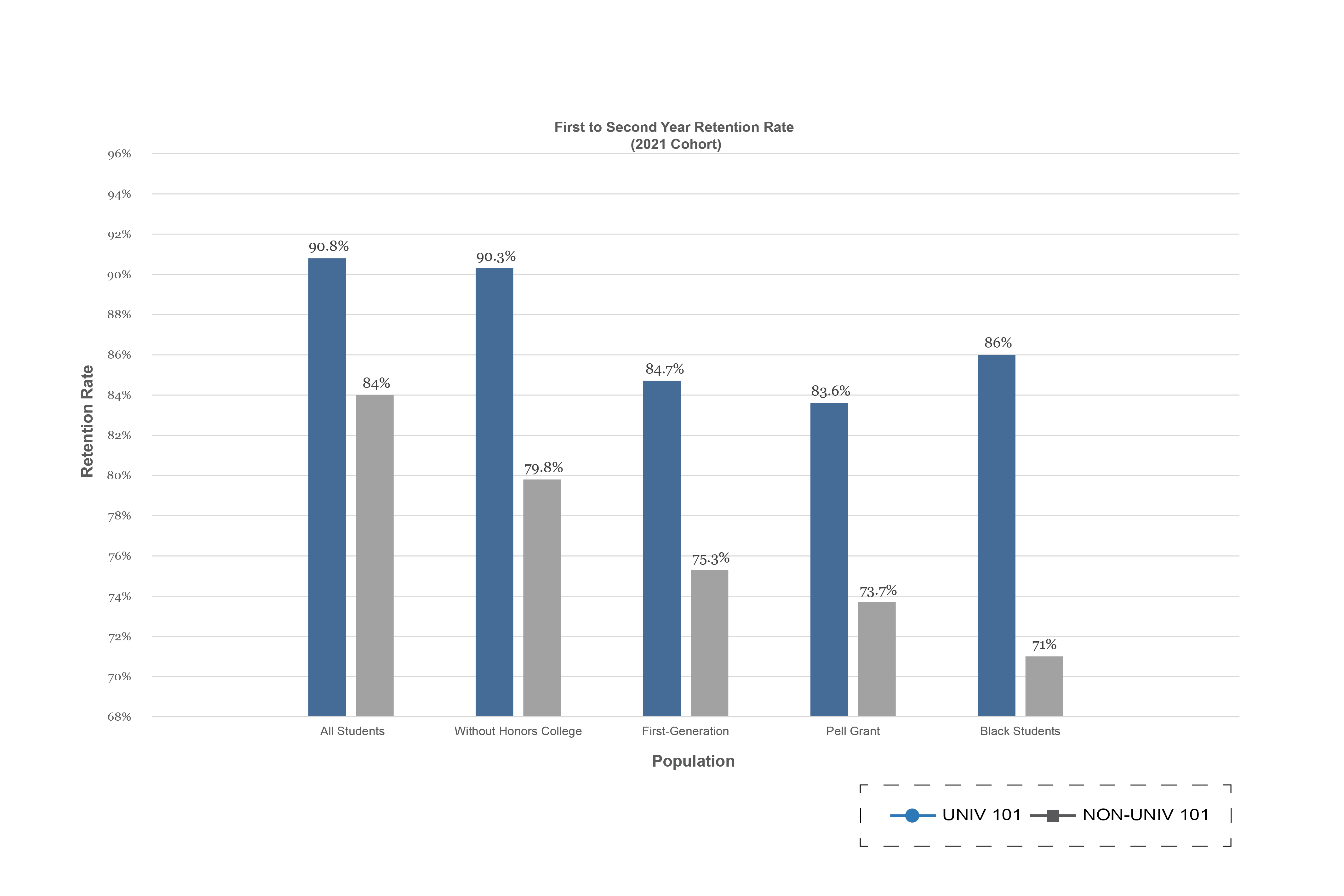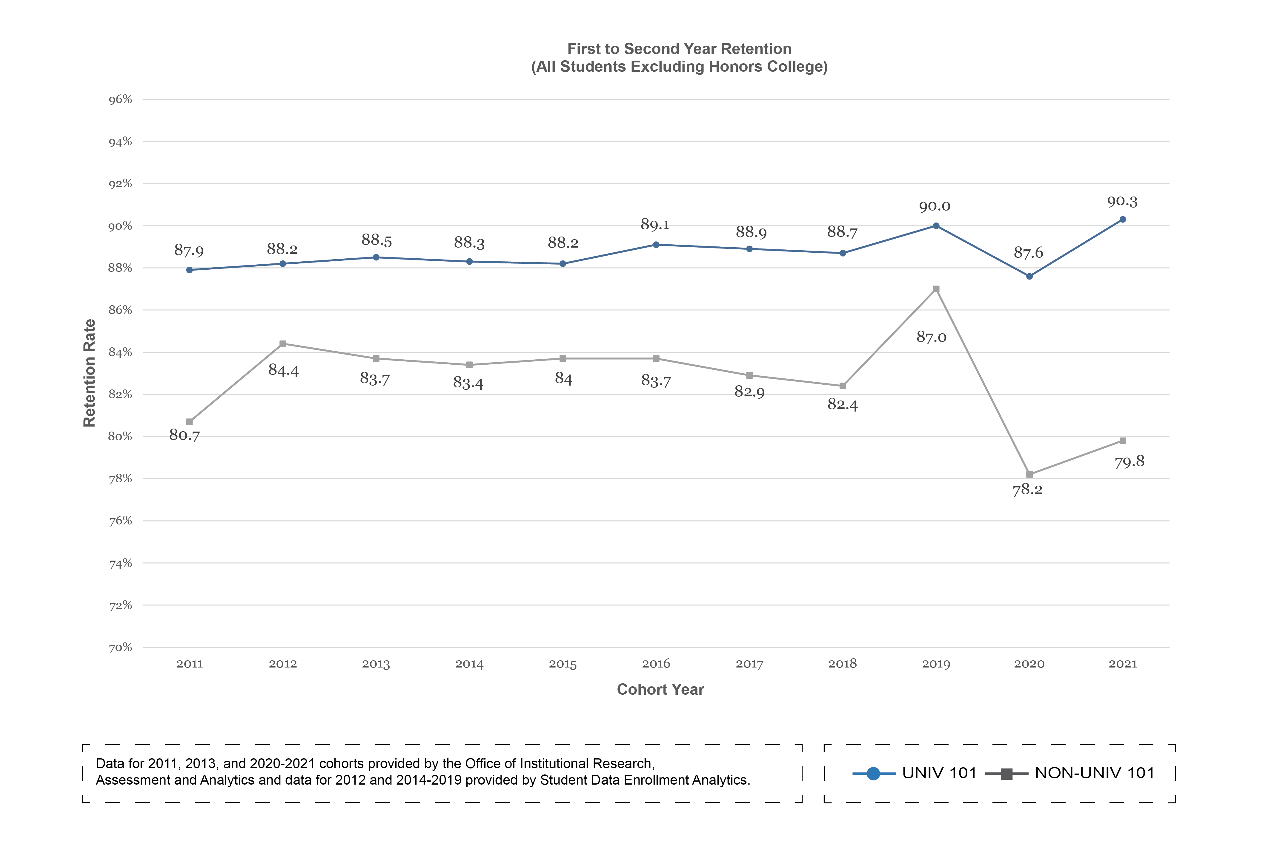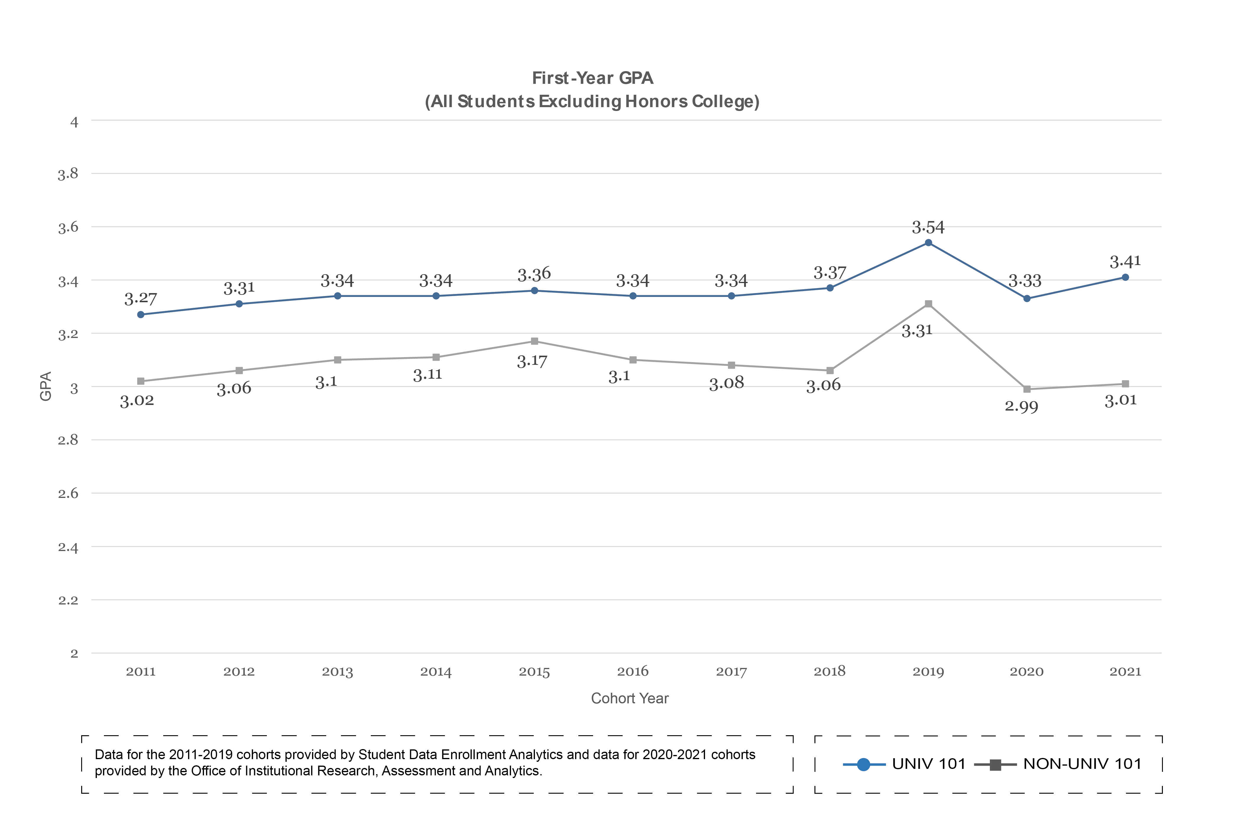 UNIV 101 students have consistently had higher one-year retention rates, six-year graduation rates and first-year GPAs than students who do not enroll in the course.
