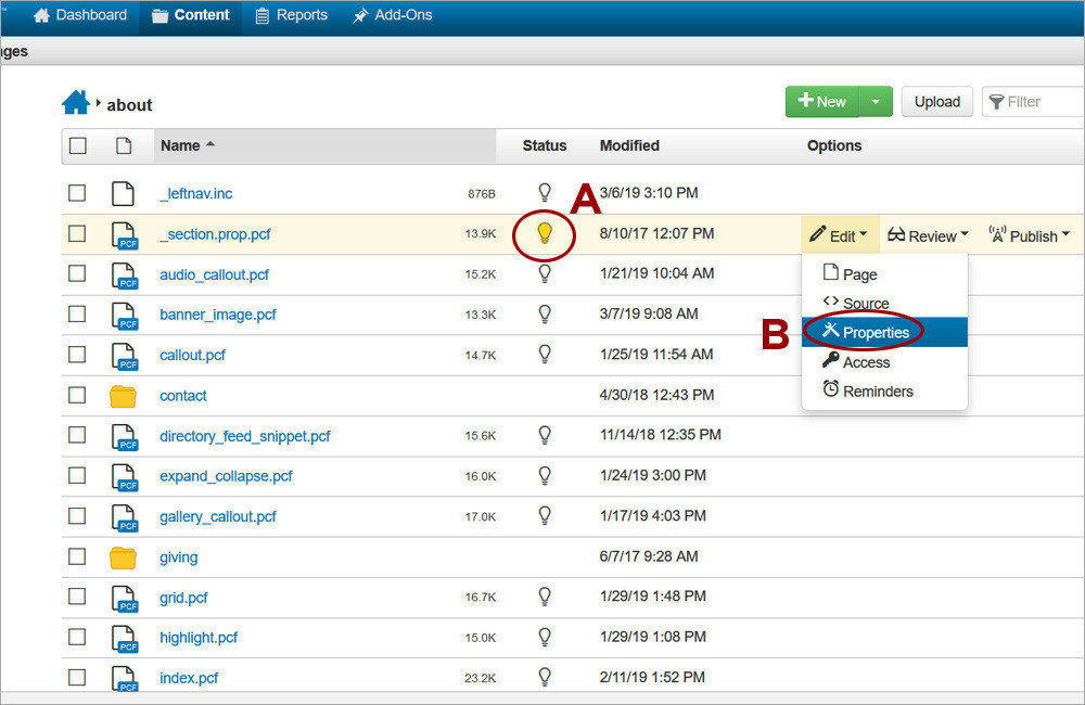 1. Configure the banner image in the _section.prop.pcf file of the main section. Check out the main _section.prop.pcf file by clicking on its light bulb (A). Hover over it and select Properties (B) from the Edit menu.