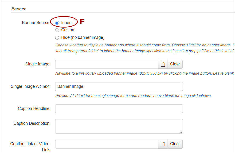 3. Update pages within the main section to inherit the banner image. All or just select pages can be set to inherit the image. To do that, for each page, check out the page and select Properties from the Edit menu as described above. In the Banner area of the Properties form, select Inherit (F) for Banner Source. Publish the updated pages.
