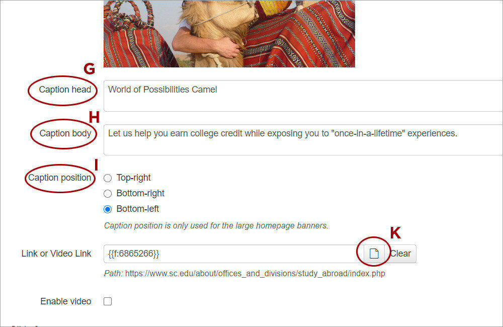 4. Provide a caption and choose its position. Update the Caption head (G). Updating the Caption body (H) is optional. If a Large Home Page Banner is being used, also select a Caption position (I). The caption box can be placed in the top right, bottom right, or bottom left corners.