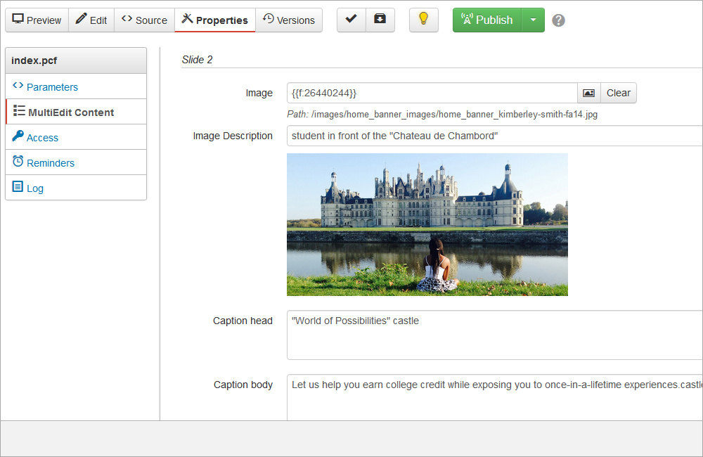 beside the image within a garnet area for the Small Home Page Banner. Update the Link or Video link (K) field to turn the Caption Head into a hyperlink. Make sure to navigate to the site