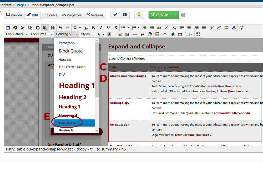 2. Leave the Title and Expanded Details headers (C). For each of the table body rows, update the text in the Title and Expanded Details (D) columns. The text in the Title column should always be styled as a Heading 5 (E). It should be a single sentence with no further formatting or hyperlinks. The text in the Expanded Details column can contain multiple paragraphs, formatting, and hyperlinks.
