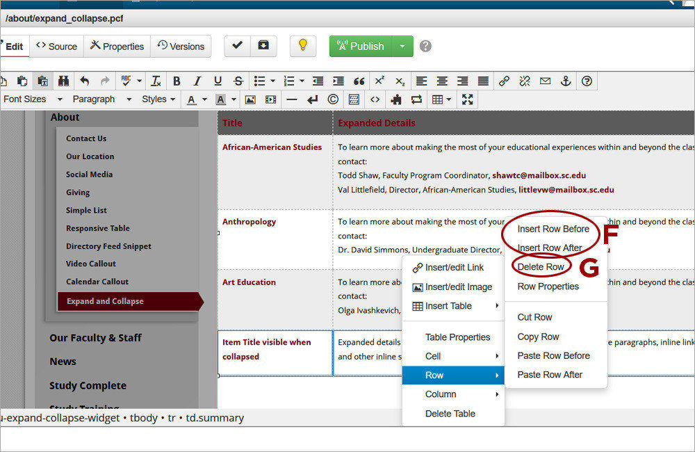 3. To add additional rows to the snippet, place the cursor in the snippet, right-click, and select Row->Insert Row Before/After (F). Alternatively, to delete unused rows of the snippet, place the cursor in the snippet, right-click, and select Row->Delete Row (G).