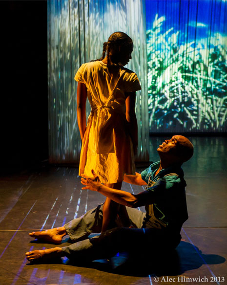 Created by technologists, dancers and visual artists, the set design is digitally constructed with a program called ISADORA. As the dancers are performing in real time, a live video feed is projected onto pre-recorded video on the Cane Field set. Sound is generated by movement during the performance to create a “real-time, constructed responsive environment. The production was conceived by Thomas F. Defrantz and created in collaboration with Wideman-Davis Dance and performed by Thaddeus Davis, Tanya Wideman-Davis, Jade Solomon-Curtis, John Green, Maria Maccaroni and Petra Morgan.