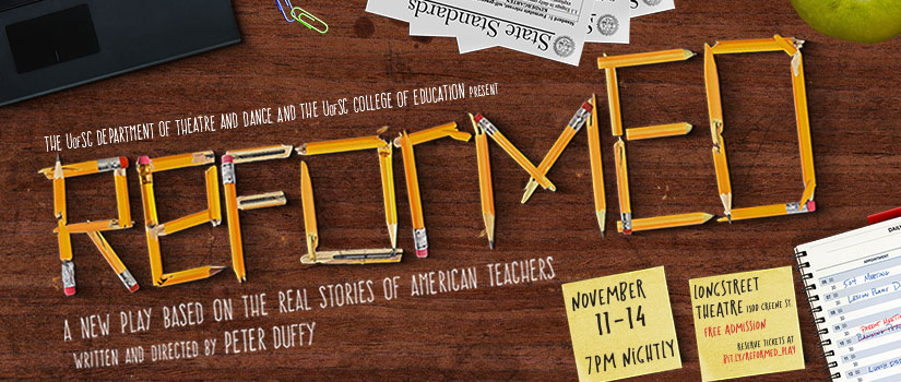 The University of SC Theatre Program, in partnership with the UofSC College of Education, will present ReformED, a brand-new play exposing the challenges of being a public school teacher in an ever-changing education landscape, November 11-14 at Longstreet Theatre.