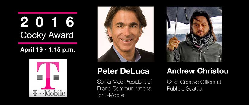 Peter DeLuca, senior vice president of brand Communications for T-Mobile, and Andrew Christou, chief creative officer at Publicis Seattle, will receive the coveted Cocky Award for Best Super Bowl commercial on Tuesday, April 19 from 1:15-2:30 p.m. in the auditorium (room 106) of the School of Journalism and Mass Communications.