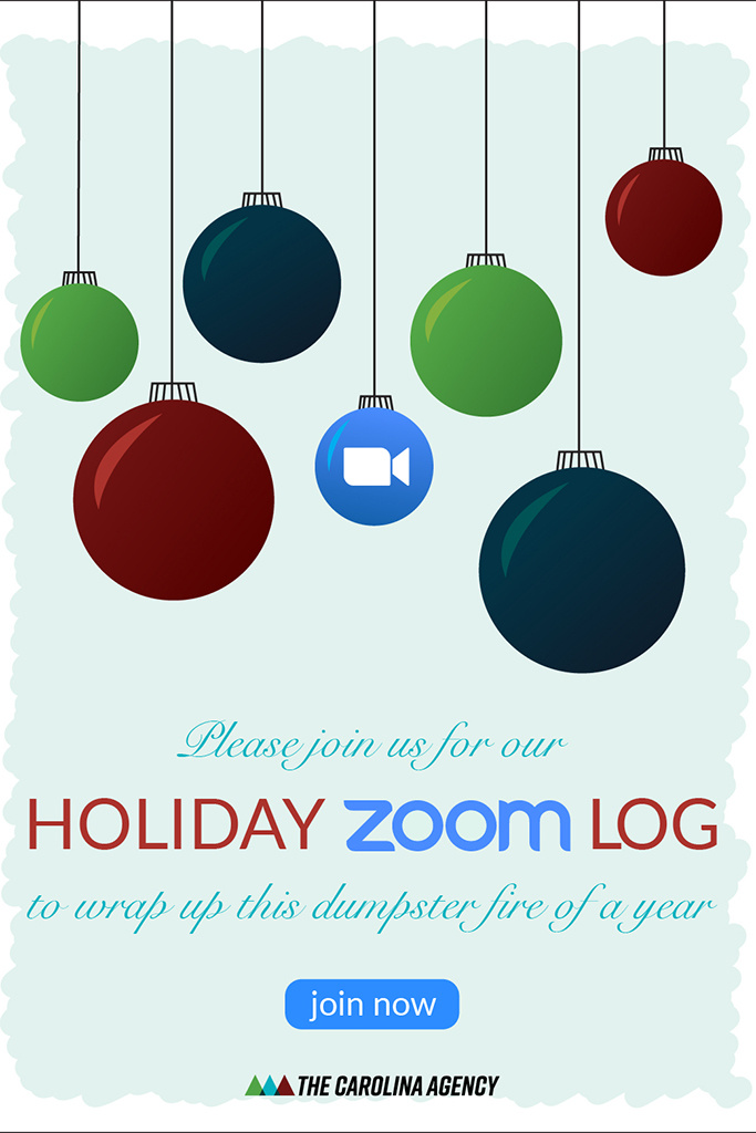 The invitation, sent during the week leading up to Christmas, asked clients to join one final zoom meeting — hopefully their final one of what they deemed the "dumpster fire year" filled with zoom meetings. Once the client clicked on the join now button on the invite they were taken to a live Zoom webinar of TCA's holiday Holiday Zoom log — a literal Christmas dumpster fire complete with Christmas lights, stockings and tree, holiday music and even an appearance from Santa (0:20 second mark).