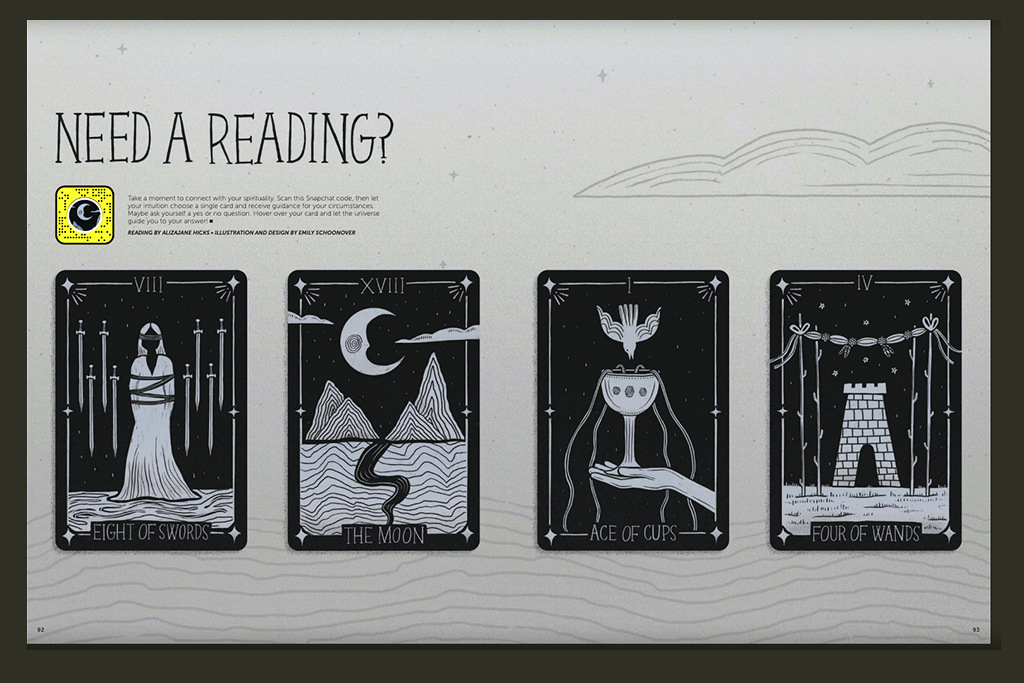 Emily Schoonover was the recipient of several other awards, including Student Best in Show and a Gold ADDY (first place) for Tarot Snap Filter, an interactive Snapchat filter which accompanied an article in the Fall 2020 Garnet & Black magazine. The filter was an augmented reality project she started developing during an Independent Study class she did with Porter.