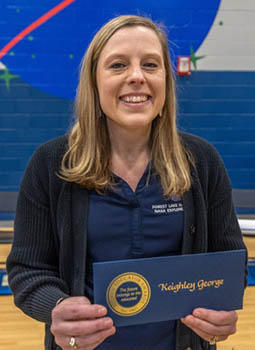 “Receiving the award was a complete surprise,” says George. “I knew our school was having an assembly, but when they called my name, it was a complete shock. Our kindergarten through fifth grade students were there and our school choir sang. It was a special moment that I will never forget.”