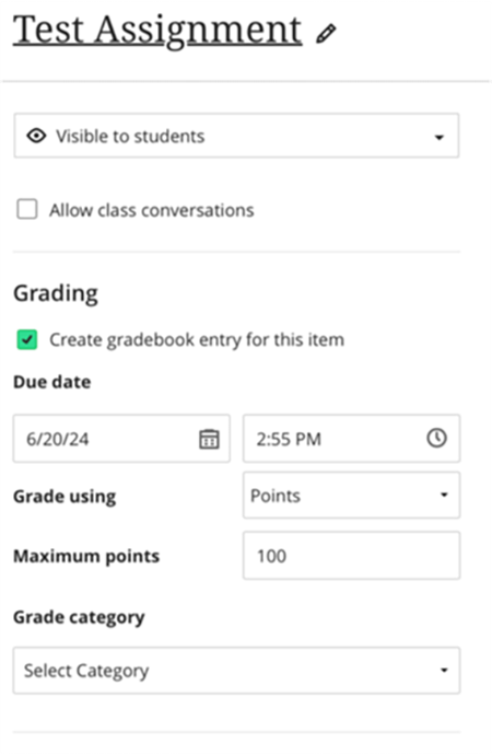 Select the pencil icon next to the title and give your assignment a unique name. Use the dropdown menu and select “Visible to Students”. Next, select “Create gradebook entry for this item” and fill in the relevant due date, the grading system you will use, maximum points, and grade category. Then, click Save.