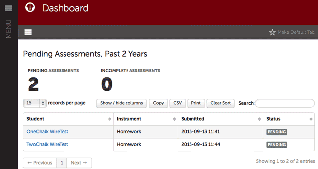 Alternatively, you can click on the Assessment tab from the Menu, then click Assess. You should now see a listing of all of your pending assessments.You can navigate to the right and click on "Completed Assessments" to see all of the assessments that you have already reviewed.  chalk and wire screenshot