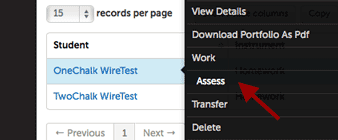 You will want to click to the right of the student's name as clicking the actual name brings up the student's profile information. Once you click in the appropriate place on the line, a contextual menu pops up.  Assess is the option you need to click.