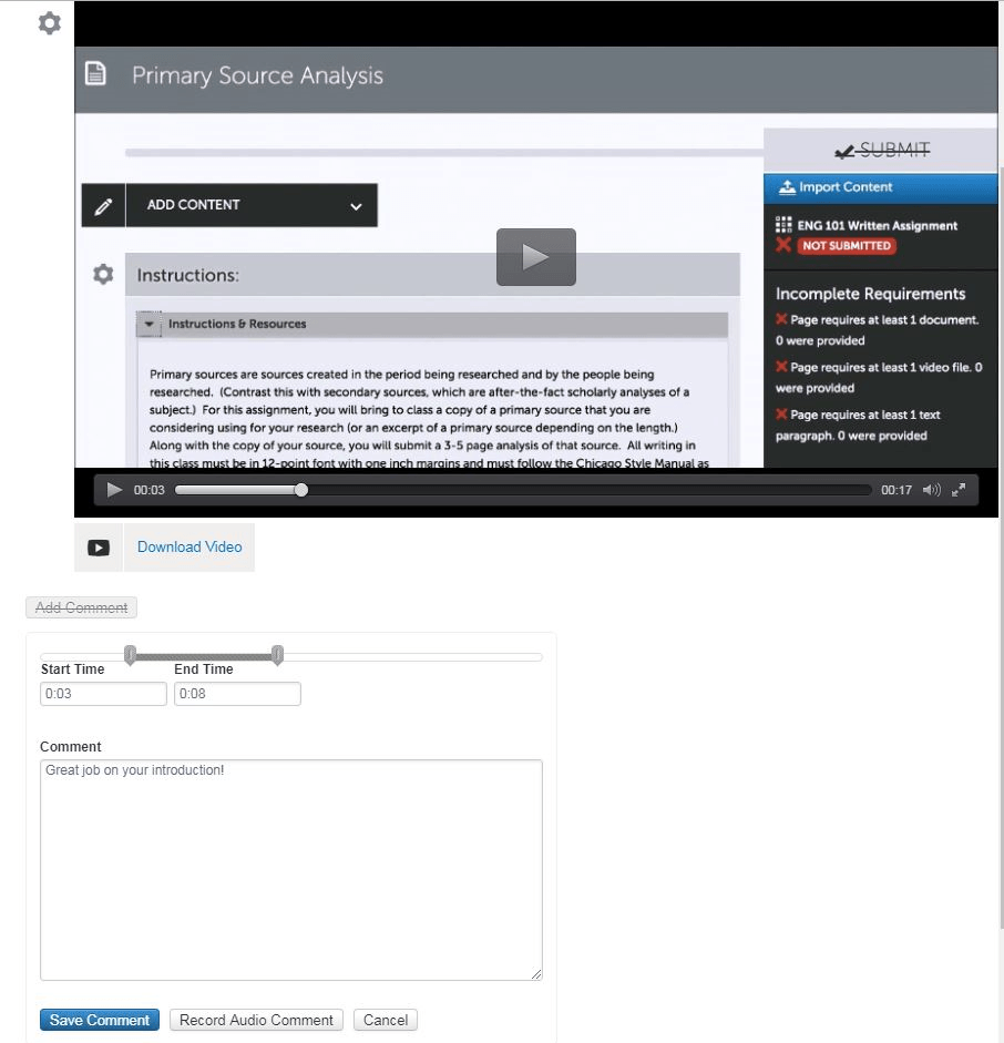 6. From here, you can view the submitted video and Add Comments by clicking on the Add Comment button below the video. This will pause the video and allow for you to comment on that frame. You can type in your comment or click Record Audio Comment to speak your comment. You can add as many comments as you like throughout the portion of the video, and your intern will receive these along with the exact part of the video each comment was left. Ensure that you click Save Comment after you complete each.