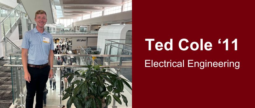 Since his graduation in 2011, electrical engineering alum Ted Cole has built a career in test/process development and model-based design for the aviation and medical industries, including electronics for sophisticated robotic systems. In January, he was promoted to principal engineer for medical equipment manufacturer Stryker, where he has worked since 2021.