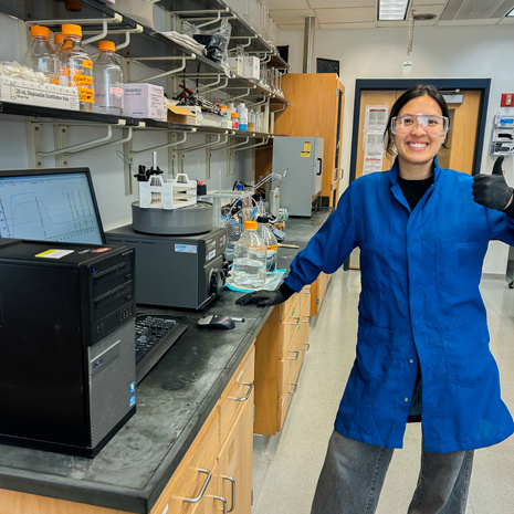 Pictured: Biochemistry student Lydia Pless in Dr. Nicholas Truex’s lab researching Therapeutic Delivery of Zinc Finger Proteins into Mammalian Cells.