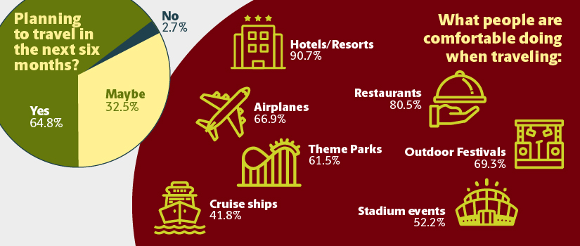 The vast majority of those planning to travel are comfortable returning to hotels and resorts (90.7%) and restaurants (80.5%). However, potential travelers are less certain about some destinations and activities thanks to the lingering effects of the pandemic.