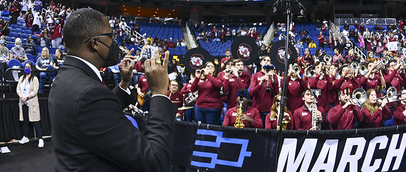“Our NCAA run, excluding conference championship play, spanned three weeks, starting in Columbia, then taking us to Greensboro, and then onto Minneapolis,” said Carolina Basketball Band Director Dr. Quintus Wrighten. “Our students performed a lot, especially in Minneapolis, with multiple engagements each day. “Watching our students take pride in supporting the team, playing well, collaborating with Gamecock cheer and engaging fans from across the country was unfathomably gratifying.”