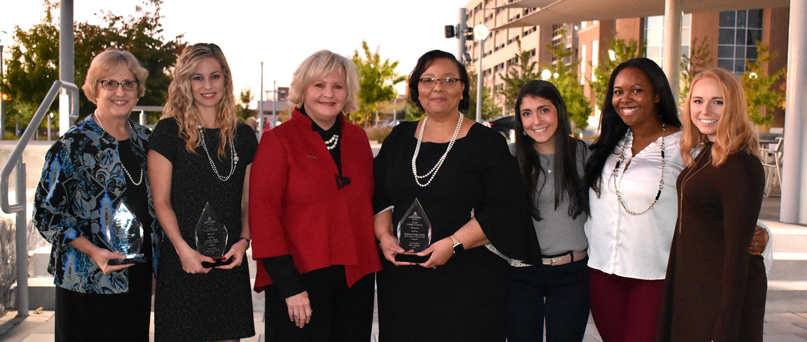 The College of Nursing presented the 2019 Alumni Awards at the Night’nTales alumni Homecoming event on November 1. Sara M. Hogg, MSN, APRN, FNP-BC, received the Outstanding Young Nurse Alumna award; Dr. Shannon Bright Smith, DNP, APRN, ACNS-BC, CNE, and Dr. Debra C. Wallace, PhD, RN, FAAN, received the Outstanding Nurse Alumna award.