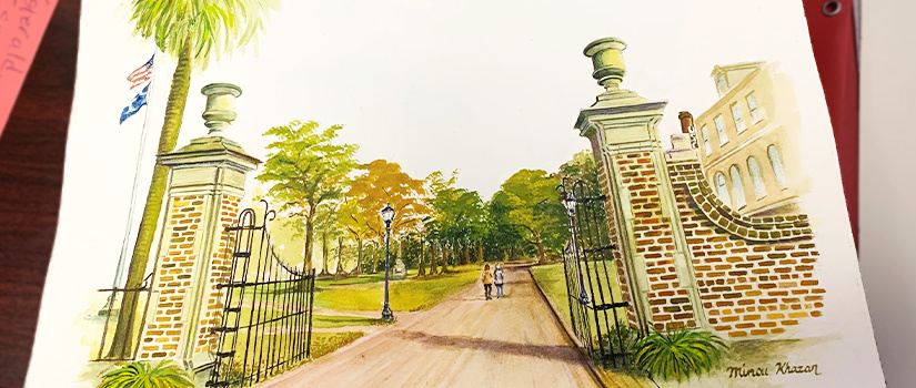 One of Khazan’s most recent works, “Out on the Horseshoe,” was commissioned by the College of Pharmacy for the upcoming Cocktails on the Horseshoe alumni event invitation. Guests at the event, set for March 30, will have the opportunity to take home a limited-edition print of “Out on the Horseshoe.” Tickets are available for purchase through March 23.