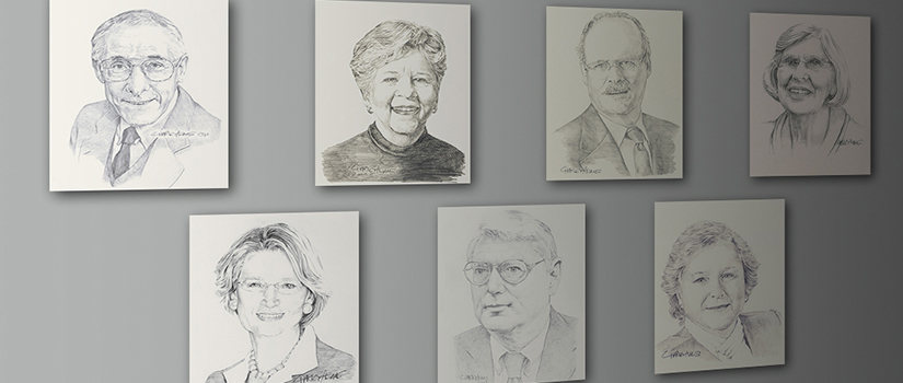 The portraits were drawn by COMD Clinical Assistant Professor Charley Adams, who has been lending his talent to creating portraits of South Carolina Business Hall of Fame inductees since the 1980s. “The department realized it could draw on the talent of one of its own faculty members to pay tribute to these individuals,” says current COMD Chair Kenn Apel. “At the same time, the portraits help students and visitors understand the impact they had made to the department and the Center.”