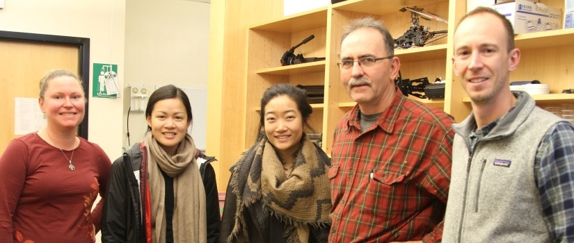 Throughout the projects, the team has noted the critical role of experiment.com in making this research possible. “These remarkable young people have opened another door for researchers to acquire research funding through a crowd funding mechanism,” says Kloot after a recent visit from two experiment.com staff members to USC’s campus (pictured above at far left with graduate student Stacie Gantz (center), Kloot (second to right), and graduate student Gabe Kenne (far right)). In addition to serving as a platform for fundraising, experiment.com also supplies features that allow researchers to engage supporters and update them on project progress.