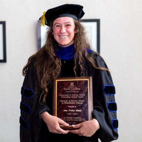 Hand was recognized at the 2019 Hooding Ceremony with her department's outstanding doctoral student award. The May graduate will remain at the Arnold School in her current role, using her degree to grow within her roles as both educator and researcher. She also has advice for current and future students who are interested in careers in athletic training and/or exercise science.