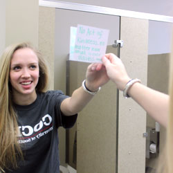 “When I was in high school, I used to write these goofy sticky notes with inspirational sayings and put them on people’s cars,” she says. “I wanted to bring that on a wider scale because I think random acts of kindness is the best way to change campus.”