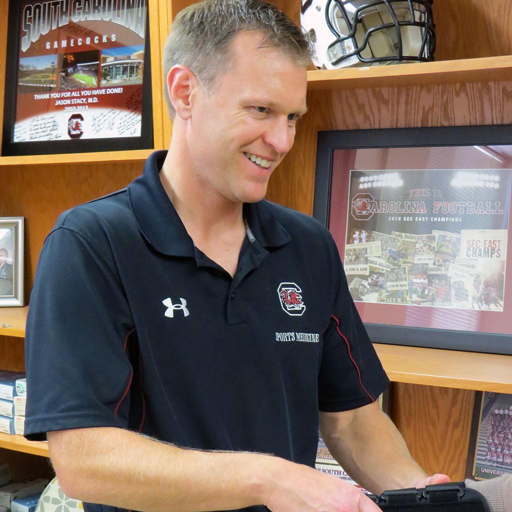 Students seeking help for a sprained ankle, can see memorabilia from his time caring for the University of South Carolina’s top football, basketball and baseball players. But Stacy thinks the mementos put students at ease.
