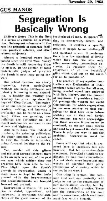 Editorial by Gus Manos, The Gamecock, Nov. 25, 1953