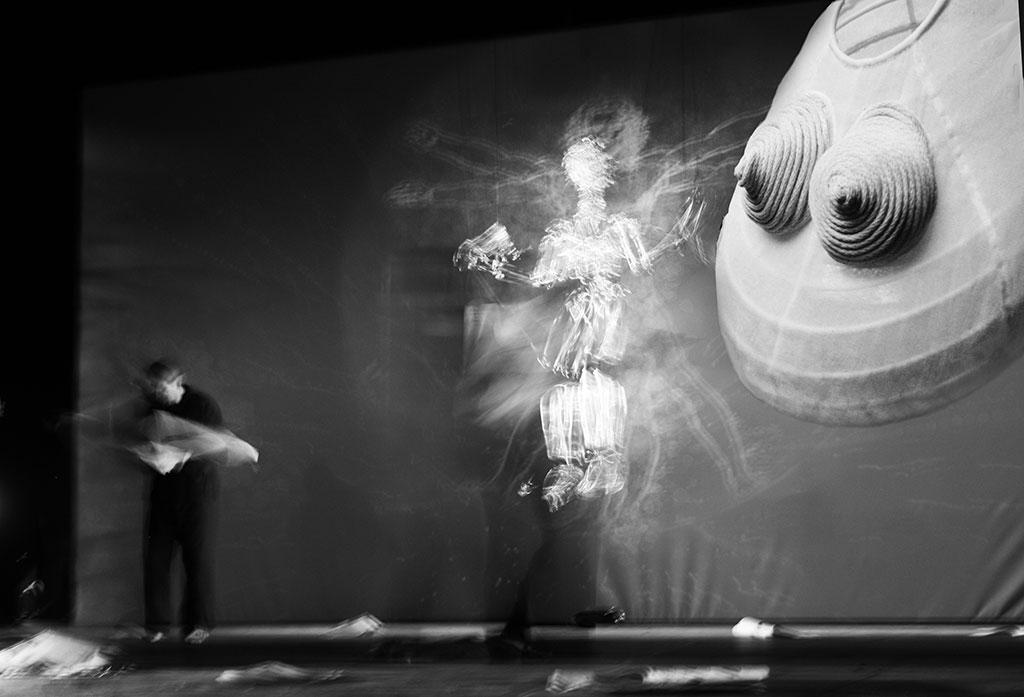 “Fusions,” which was presented at the World Stage Design conference in Wales, remains one of the most challenging projects of DuBose’s design career so far. “We knew the show was going to Great Britain. This added a new set of obstacles,” she explains. “Primarily, designing costumes to fit inside suitcases.” One piece, a garment that had a large “belly” about three feet round, was particularly hard to construct.