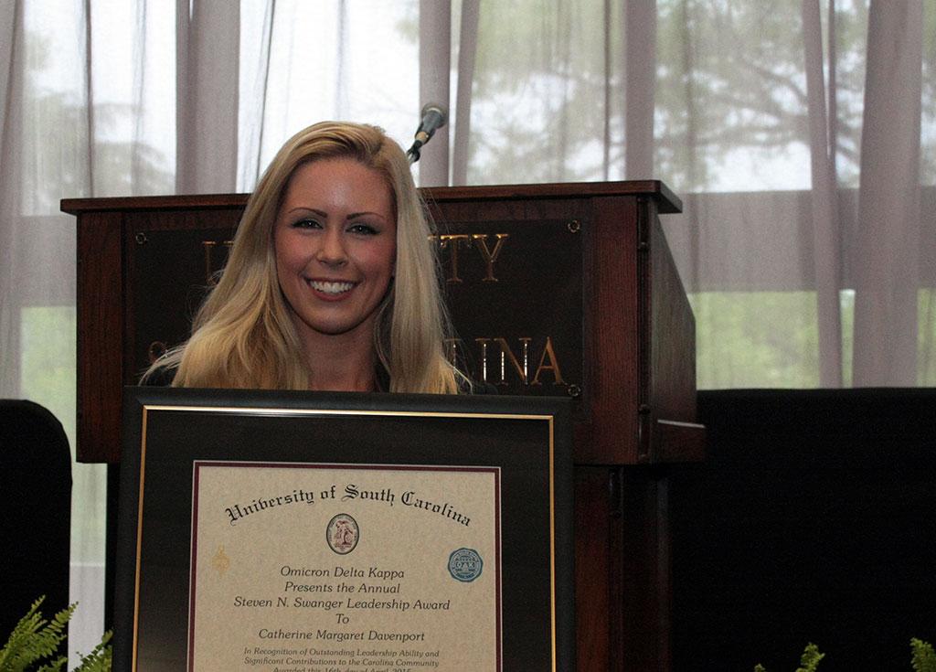 But the Columbia native found support and a second family among her sisters of Chi Omega and fellow Capstone Scholars and members of Omicron Delta Kappa, the organization that presented Davenport the 2015 Steven N. Swanger Award for exemplary leadership.