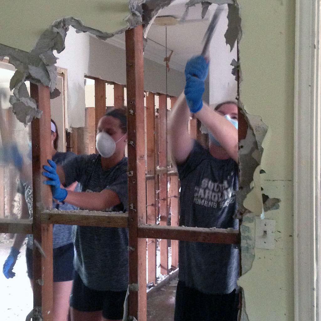 Classes had been canceled, but the team was able to play its match later that week. Then they went out into the neighborhoods to see how they could help. Most homeowners were facing a race against the clock. Everything that had gotten wet had to go, including carpet, hardwood floors, sheetrock and insulation. Houses had to be gutted and taken down to the studs before the water-mitigation services could come in and make sure mold and mildew didn’t become a permanent problem.