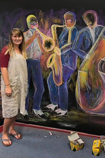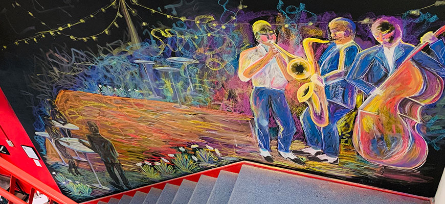 The subject she chose for a mural she created for the staircase wall in the Music Library, which is housed in the School of Music, reflects that connection. It features a jazz ensemble in an outdoor venue, which she created in rich jewel tones using chalk.