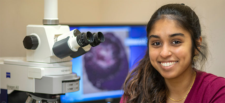 She got her first taste of research her freshman year at UofSC, and she’s been immersed in it ever since, including working with Lydia Matesic, associate professor of biological sciences. Pande has worked in Matesic’s lab all four years, and she received a Magellan Scholar award for the work, “Histological Analysis of Mucus Layers in ITCH-deficient mice.” Her research findings formed the basis of her senior thesis for the Honors College.