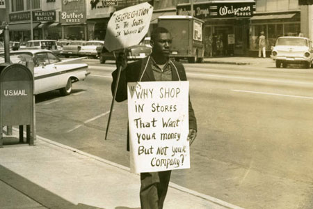 To me, the signs show the reasoned arguments of the movement (“Why shop in stores that want your money but not your company,” “Unequal protection is unconstitutional”) and the emotion (“Together we Stand, Divided we fall, So Let’s Pull together!”). Following the civil rights era, in the late 1960s and 1970s, signs and slogans often spoke of the biased employment and hiring practices and of police brutality.