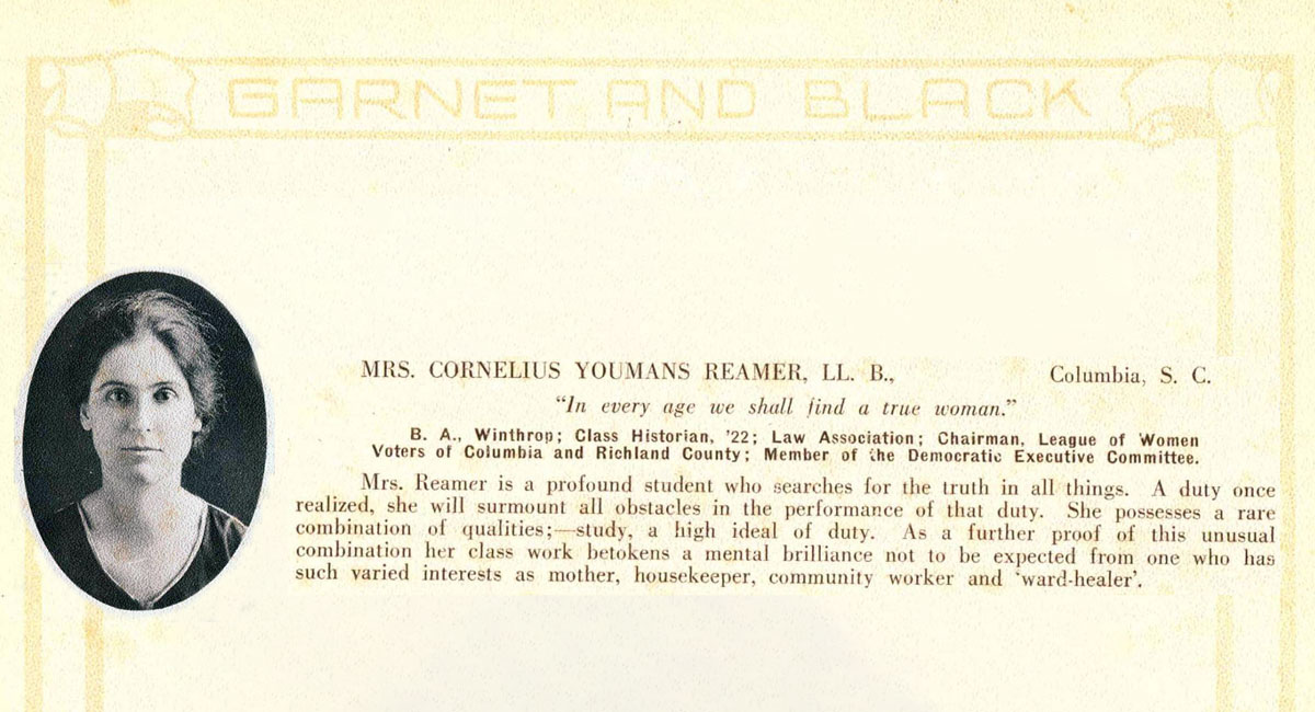 As early efforts to get women’s suffrage into the South Carolina Constitution failed, a new push came in the early 20th century when well-connected and well-educated women from some of the state’s best known political families took up the fight. While their efforts were not successful — the state Legislature did not formally ratify the 19th amendment until 1969 — women still made incursions into new fields, such as law and medicine, with UofSC graduating its first female law student in 1918 and, four years later, Ida Salley Reamer, who had spent years traveling the state campaigning for suffrage, graduated first in her UofSC law class of 1922.