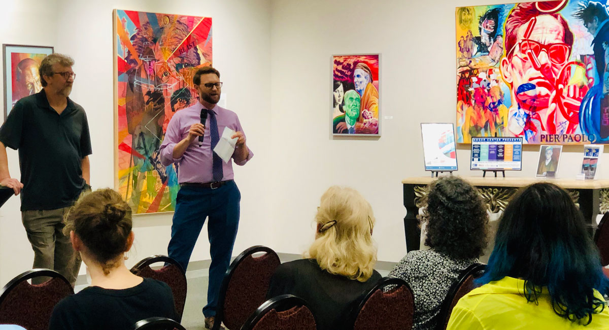 Artist Colin Dodd and Koger Center Director Nate Terracio speak to a group in the Upstairs Gallery.