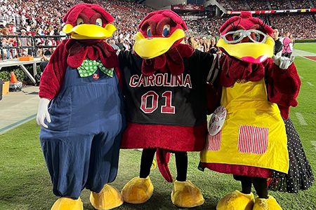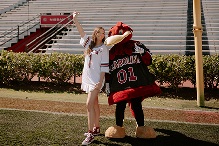 Being Cocky has taken Sylvester to places she couldn’t even imagine, from ringing the bell at the New York Stock Exchange to cheering on the women’s basketball team at the Final Four and taking the football field with her parents — all three of them dressed as Cocky — during Family Weekend festivities.