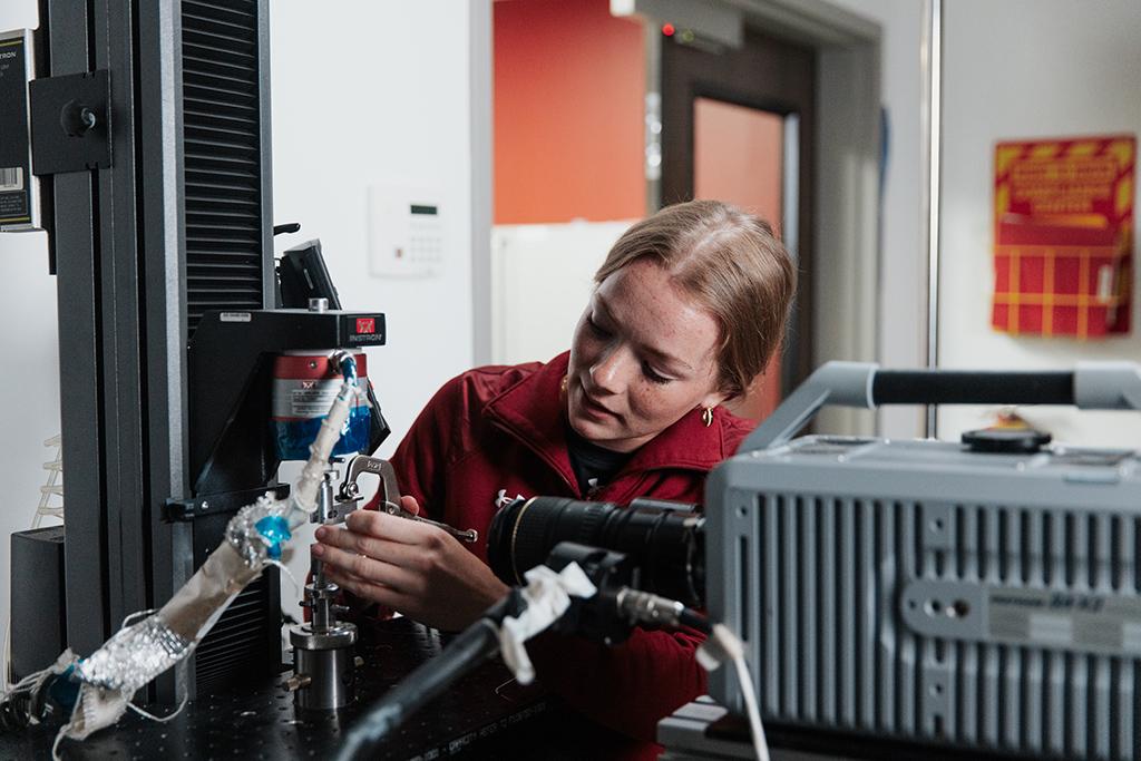 Voortmeyer studies a composite material called Tensylon, which is used in ballistic protection such as helmets and vests. Her research focuses on fracture mechanics, analyzing how cracks spread through the material and the energy that requires. While she runs tests on small samples, the resulting data is used to refine digital models with the goal of making armor design more accurate and reliable.